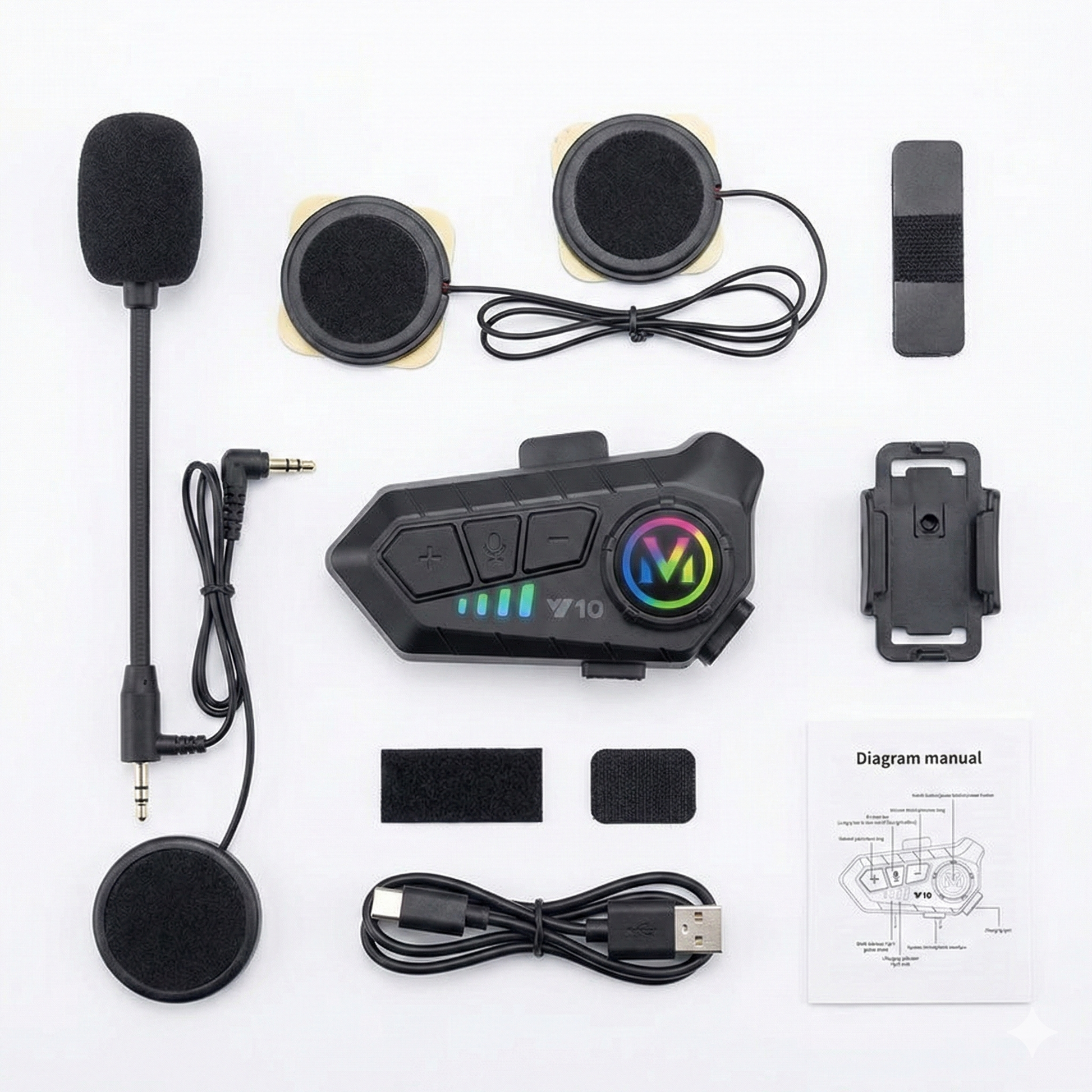 El RiderLink V10™ es tu copiloto definitivo para esas rutas largas, el tráfico de la ciudad o tus viajes de fin de semana. Su diseño aerodinámico y su sistema de iluminación RGB hacen que tu casco luzca moderno mientras te mantienes conectado. ¡Seguridad y entretenimiento en un solo dispositivo!